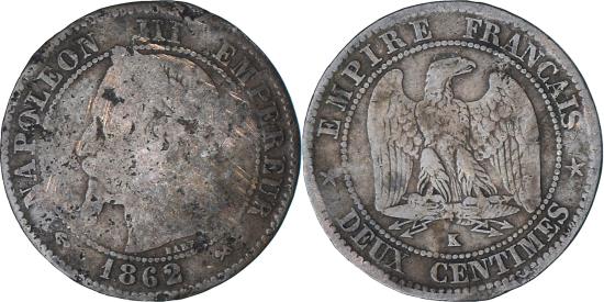 | | Coin, France, Napoleon III, Napoléon III, 2 Centimes, 1862, Bordeaux | | | Napoléon III, Laureate head left, Denomination within wreath | | FEATURES |