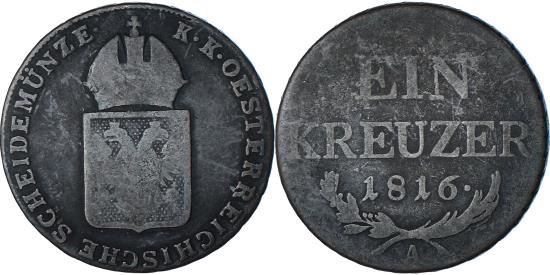| | Coin, Austria, Franz II (I), Kreuzer, 1816, , Copper, KM:2113 | | | Crowned shield, Value in German, Struck until 1852 with 1816 date. | | FEATURES |