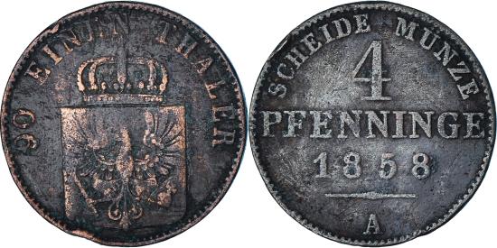 | | Coin, German States, PRUSSIA, Friedrich Wilhelm IV, 4 Pfennig, 1858, Berlin | | | Crowned shield of eagle arms with FR monogram on breast, 3-line inscription with date, mintmark in exergue, Ref. N48., 90 EINEN THALER | | FEATURES |