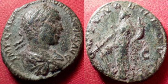 ELAGABALUS AE as. Struck circa 218-219 AD. IMP CAES M AVR ANTONINVS PIVS AVG, laureate, draped and cuirassed bust right. Reverse - FORTVNAE REDVCI, Fortuna standing left, holding rudder and cornucopiae, SC in fields. C 53. BMC 367. RIC 349. 23mm, 10.3g. |