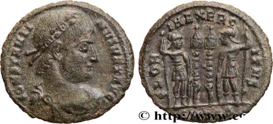 CONSTANTINE I THE GREAT Augustus Centenionalis ou nummus 330-333 Thessalonique copper Obverse : CONSTANTI-NVS MAX AVG Buste diadémé, drapé et cuirassé de Constantin Ier à droite, vu de trois quarts en avant (Ac) ; diadème perlé et gemmé Reverse : GLOR-IA EXERC-ITVS// SMTSA Deux soldats debout face à face, vêtus militairement, tenant chacun une haste renversée et un bouclier ; au milieu, deux étendards Commentary : Flan ovale, idéalement centré. De jolis détails. Usure régulière, superficielle. Patine gris foncé