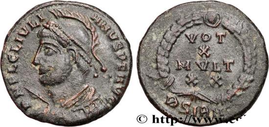 JULIAN II THE PHILOSOPHER Augustus Maiorina ou nummus 363 Sirmium R1 copper Obverse : D N FL CL IVLI-ANVS P F AVG Buste barbu, diadémé, casqué, drapé et cuirassé de Julien II auguste à gauche, vu de trois quarts en avant, tenant la lance de la main droite et le bouclier de la gauche (C4) Reverse : VOT/ X/ MVLT/ XX// BSIRM Légende en quatre lignes dans une couronne Commentary : Jolie monnaie sur un flan centré, finement détaillée des deux côtés. Fine usure régulière. Patine gris foncé