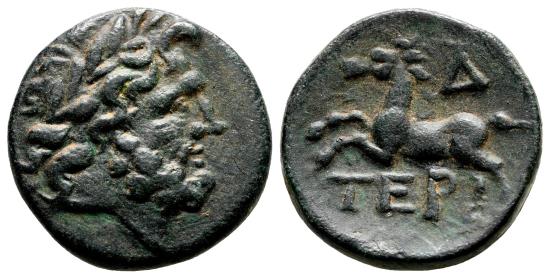 Obverse: Laureate head of Zeus right. Reverse: TEΡ beneath free horse galloping left, date Δ (year 4) above. Very good coin, in EF- condition, conserving full details in both sides and a precious green patina. SNG France 2107-8. Termessus Maior, Year 2 = 69-68 BC. 4,45 g - 18 mm -------------------------------------------------------------------------------------------------- Visit our site about Numismatics and Archaeology: aeternitas-numismatics.com |