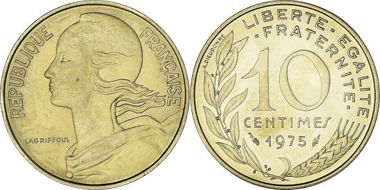 | | Coin, France, Marianne, 10 Centimes, 1975, Paris, série FDC, | | | Marianne, Liberty bust left, Denomination above date, grain sprig below, laurel branch at left, Without mint mark. 1991-1993 dated coins, non-Proof, exist in both coin and medal alignment., Henri Lagriffoul | | FEATURES |