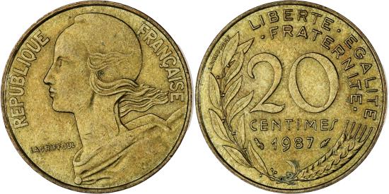 | | Coin, France, Marianne, 20 Centimes, 1987, Paris, , Aluminum-Bronze | | | Marianne, Liberty bust left, Denomination above date, grain sprig below, laurel branch at left, Without mint mark. 1991-1993 dated coins, non-Proof, exist in both coin and medal alignment., Henri Lagriffoul | | FEATURES |