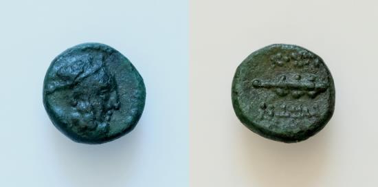 | Bruttium, Petelia, late 3rd century BC. Æ (9,5mm, 1.3g). Bearded head of Herakles r., wearing tainia. R/ Club. |