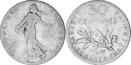 | | Coin, France, Semeuse, 50 Centimes, 1899, Paris, , Silver, KM:854 | | | Semeuse, Figure sowing seed, Leafy branch divides date and denomination, Without mint mark. | | FEATURES |