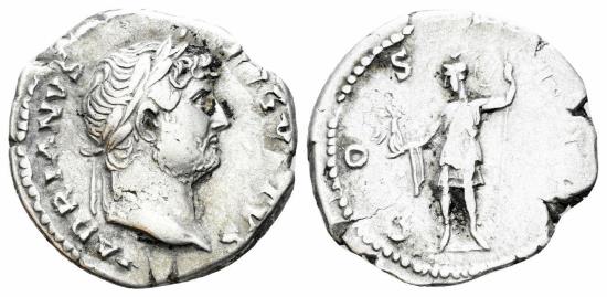 Hadrian. 117-138 AD. AR Denarius (3.33 gm, 19mm). Rome mint. Struck circa 124-8 AD. Obv.: HADRIANVS AVGVSTVS, laureate head right. Rev.: COS IIII, Roma standing left, holding Victory and reversed spear. RIC 161; BMCRE 366; RSC 349a. VF.