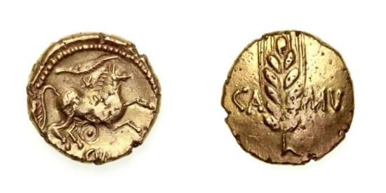 The Borden Hoard Catuvellauni & Trinovantes Cunobelin 8-41AD Gold Stater Wild Ring type Corn ear without central stalk. CA to left, MV to right/ Horse right, star and branch above. Pellet in ring. CVNO below The Borden Hoard A tip off from a chance find in Kent during the 19th Century led metal detectorists to discover this wonderful hoard of Iron Age gold coins dating back to the 1st century AD. The hoard consisted of 42 gold staters of king Cunobelin and was declared then disclaimed under the Treasure act. Coins from this exciting find are available to private collectors exclusively from Silbury Coins Ltd, the leading British Iron Age coin dealership. Each coin will come with a detailed informative booklet, information from which can also be viewed online. ABC2783, PAS BH-137A04, CH35. Scarce 17x18mm, 5.46g A rare opportunity to purchase a British Iron Age gold coin from a fully provenanced hoard find, seldom are finds like this disclaimed and made available to the private collector. Hoard coins are often in high grade and these are no exception. These coins have been carefully struck, seen little circulation and have little wear through being in the ground, hard to believe they are 2000 years old! |