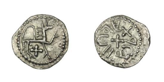 Kings of Northumbria Alchred 765-774AD Silver Sceatta Small cross/Stylized stag with cross below. S849, 13x14mm, 1.06g Provenance will be provided.
