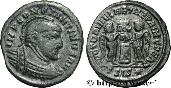 VICTORIAE LAETAE PRINC PERP/ VOT/ PR/ -|-// (gamma)SIS* Deux Victoires debout, face à face, posant un bouclier sur un cippe