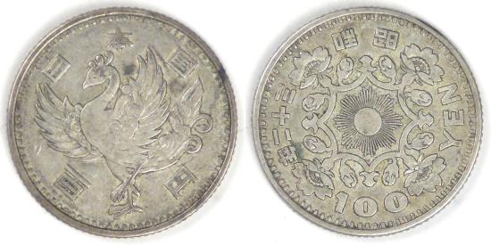 Obv: Phoenix with “State of Japan” above and “100 Yen” below