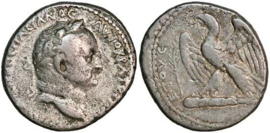 Tetradrachm dated 69-79 AD, struck under Emperor Vespasian in Seleucis and Pieria, Antioch. Fine condition. Laureate head of Vespasian right / Eagle standing left on club; wreath in beak; palm front to left. Ex. Bank Leu 19. oktober 1976.14,1 g.