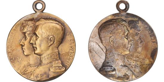 | | Belgium, Medal, Albert et Elisabeth, 1914, L'Hommeau, , Copper | | | Accosted busts left, The figure of kindness holding the prince in front of the queen, . LL . MM . ALBERT . ET . ELISABETH, LA BONTÉ RÈGNE DANS LES COEURS | | FEATURES |