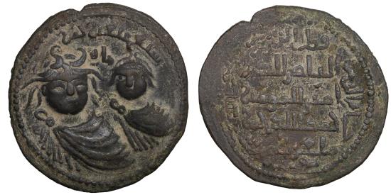 ARTUQIDS OF MARDIN. Il-Ghazi II, 1176-1184, AE dirham. 16.00 gr. – 35.4 mm. NM, AH577, , large & small draped busts facing, lovely strike, pleasing patina, beautifully centered. A-1828.2, SS-32.1. aXF