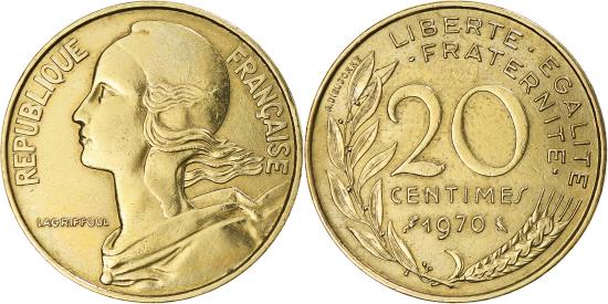| | Coin, France, Marianne, 20 Centimes, 1970, Paris, , Aluminum-Bronze | | | Marianne, Liberty bust left, Denomination above date, grain sprig below, laurel branch at left, Without mint mark. 1991-1993 dated coins, non-Proof, exist in both coin and medal alignment., Henri Lagriffoul | | FEATURES |