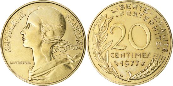 | | Coin, France, Marianne, 20 Centimes, 1977, Paris, , Aluminum-Bronze | | | Marianne, Liberty bust left, Denomination above date, grain sprig below, laurel branch at left, Without mint mark. 1991-1993 dated coins, non-Proof, exist in both coin and medal alignment., Henri Lagriffoul | | FEATURES |
