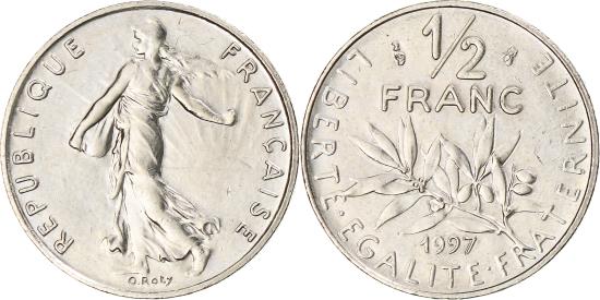 | | Coin, France, Semeuse, 1/2 Franc, 1997, Paris, , Nickel, KM:931.1 | | | Semeuse, The Seed Sower, Laurel divides denomination and date, Without mint mark. | | FEATURES |