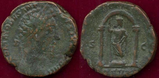 AE Sestertius 17.9 grams, 29mm O:Laureaate bust of Commodus right R:PM TR P XI IMP VII COS V PP, Janus facing standing on plinth standing on a plinth, holding sceptre within an arched shrine supported by two pillars Catalog reference: RCV #5780, RIC III 460