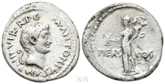 Obv: M ANTONIVS IMP III VIR R P C. Bare head right; lituus to left. Rev: PIETAS - COS. Pietas standing left, holding turibulum (incense censer) and cornucopia.
