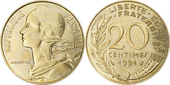 | | Coin, France, Marianne, 20 Centimes, 1991, Paris, , Aluminum-Bronze | | | Marianne, Liberty bust left, Denomination above date, grain sprig below, laurel branch at left, Without mint mark. 1991-1993 dated coins, non-Proof, exist in both coin and medal alignment., Henri Lagriffoul | | FEATURES |