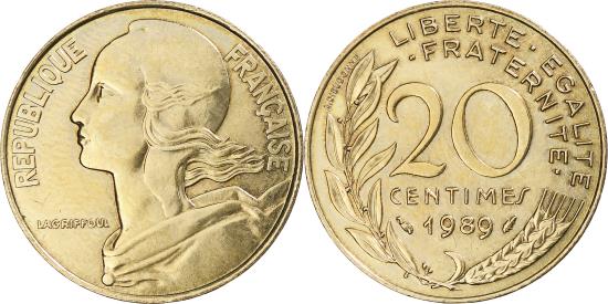 | | Coin, France, Marianne, 20 Centimes, 1989, Paris, , Aluminum-Bronze | | | Marianne, Liberty bust left, Denomination above date, grain sprig below, laurel branch at left, Without mint mark. 1991-1993 dated coins, non-Proof, exist in both coin and medal alignment., Henri Lagriffoul | | FEATURES |