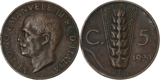 | | Coin, Italy, Vittorio Emanuele III, 5 Centesimi, 1929, Rome, , Bronze | | | Head left, Wheat ear divides value, A. Silvio Motti | | FEATURES |