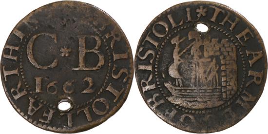 | | Great Britain, Token, Farthing Bristol, 1662, Gloucestershire, , Copper | | | Letters above date with engraver's initial below, all within inner circle, legend around., Sailing ship issuing from castle within inner circle, legend around. | | FEATURES |