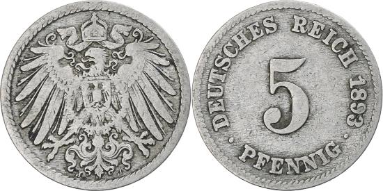 | | Coin, GERMANY - EMPIRE, Wilhelm II, 5 Pfennig, 1893, Hamburg, | | | Denomination, date at right, Large crowned imperial eagle with shield on breast, Struck from 1890-1915. | | FEATURES |