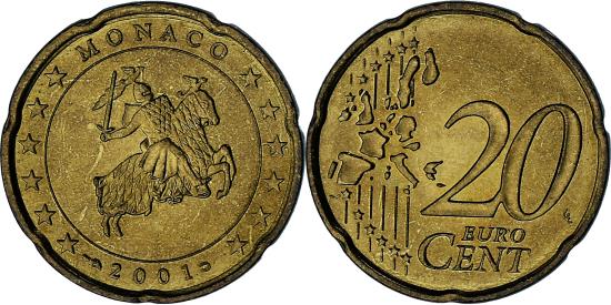 | | Monaco, Rainier III, 20 Euro Cent, 2001, Paris, , Brass, Gadoury:MC176 | | | Knight on horse, Value and map | | FEATURES |