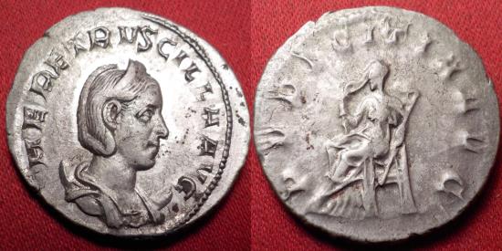 HERENNIA ETRUSCILLA AR silver antoninianus. Rome, 250 AD. HER ETRVSCILLA AVG, diademed & draped bust right, crescent below. Reverse - PVDICITIA AVG - Pudicitia, veiled, seated left, with right hand drawing veil from face and holding scepter. Cohen 19. 23mm, heavy 4.8g.