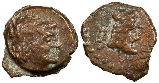 AE Chalkous 1.30g. 12mm. Kyrene mint Diademed head of Ptolemy I r. wearing aegis around neck. Head of Libya r. wearing tainia; small cornucopia below chin. BASILEWS PTOLEMAIOU CPE B489; Svoronos 869 Rare. Tan-brown patina. Crudely cast, irregular flan. Carelessly struck. Minor roughness. Lorber notes that this type saw considerable variation in style and production, likely a result of its production spanning many years, possibly into the reign of Ptolemy IV.