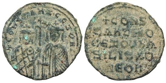 AE Follis 7.50g. 26mm. Constantinople Mint Facing busts of Cosntantine VII, beardless (on l.), and Zoe (on r.), both crowned and holding between them long patriarchal cross; Constantine wears loros, his mother wears chlamys. +CONSTANT' CE ZOH b' Legend in five lines. +CONS/TANTINO'/CE ZOH bA/SILIS RO/MEON SB 1758 Green patina. Small corrosion spots. Slightly grainy surfaces. Some cleaning marks.