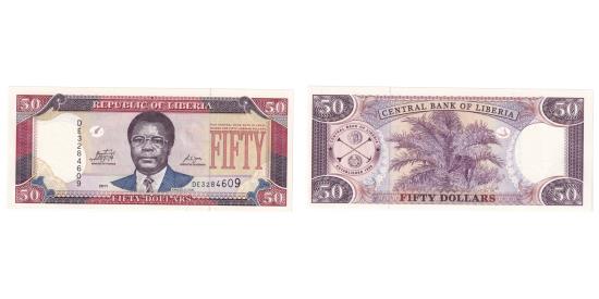 | | Banknote, Liberia, 50 Dollars, 2011, KM:29d, UNC(65-70) | | | 2009., 2 signatures., CENTRAL BANK OF LIBERIA at top., Purple, red and blue on multicolor underprint. | | FEATURES |