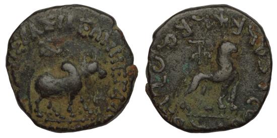 INDO-SKYTHIANS: Azes, circa 58-12 BC. AE tetradrachm (13.58 g). Obv: humped bull standing right, monogram (control mark) above, Kharoshthi letter shi on lower right, Greek legends around BAΣIΛEΩΣ BAΣIΛEΩN MEΓAΛOY AZOY / Rev: lion standing right, Monogram (control mark) above, same azes title in Kharosthi around, VF. Interesting Ancient Bilingual Coin with Greek & Kharoshti legends.
