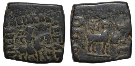 INDO-SKYTHIANS: Azes, circa 58-12 BC. AE Square tetradrachm (11.28 g). Obv: king Azes on horseback to right holding whip or sword, Greek legends around / Rev: humped bull standing right, monogram (control mark) above, Kharosthi letter on right, same azes title in Kharosthi around, F-VF. Interesting Ancient Bilingual Coin with Greek & Kharoshti legends.