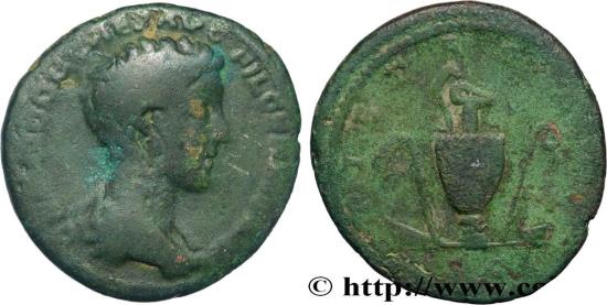 COMMODUS Caesar Moyen bronze, dupondius ou as 175-176 Rome copper Obverse : COMMODO CAES AVG - FIL GERM SARM Buste drapé, tête nue de Commode à droite, vu de trois quarts en arrière (A°21) Reverse : PIETAS AVG Instruments pontificaux : couteau, aspersoir, vase (capis), lituus et simpulum Commentary : Exemplaire centré à l’usure importante mais régulière. Buste agréable. Patine vert foncé