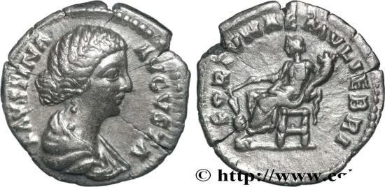 FAUSTINA MINOR Augusta Denier 165-175 Rome R2 silver Obverse : FAVSTINA - AVGVSTA Buste diadémé et drapé de Faustine Jeune à droite, avec les cheveux relevés coiffés en chignon (L) Reverse : FORTVNAE MVLIEBRI Fortuna (la Fortune) drapée, assise à gauche, tenant un gouvernail de la main droite et une corne d’abondance de la main gauche Commentary : Monnaie sur un flan idéalement centré, fissuré à 4h. Joli buste de Faustine, bien venu à la frappe. Revers agréable. Patine grise