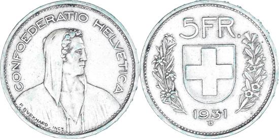 | | Coin, Switzerland, 5 Francs, 1931, Bern, , Silver, KM:40 | | | William Tell right, Shield flanked by sprigs, Raised edge lettering. | | FEATURES |