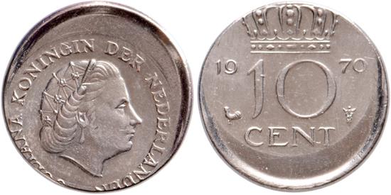 Voorzijde: portret van Juliana naar rechts Keerzijde: 10 cent onder kroon Ca. 20% excentrisch geslagen