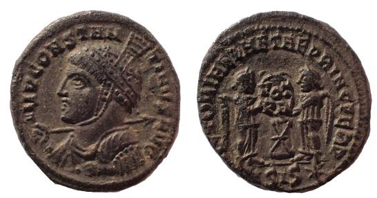 Constantine I, 307/310-337. Follis Ae 18 mm. 3.0 gm. Siscia, 318. Obv: IMP CONSTANTINVS AVG Helmeted and cuirassed bust of Constantine I to left, holding spear over his right shoulder. Rev: VICTORIAE LAETAE PRINC PERP / [officina letter]SIS✱ Two victories holding shield inscribed VOT / PR over altar. RIC 49.