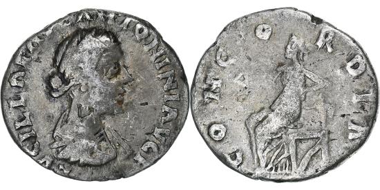 | | Lucilla, Denarius, 164-180, Rome, Silver, , RIC:757 | | | Bust of Lucilla, bare-headed, hair waved and fastened in a bun on back of head, draped, right., Concordia, draped, seated left on low seat, holding patera in extended right hand and resting left elbow on statuette of Spes; under seat, cornucopiae., LVCILLAE AVG ANTONINI AVG F, CONCORDIA | | FEATURES |
