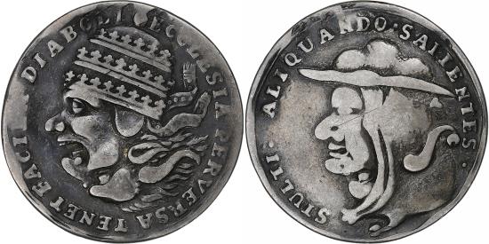 | | Great Britain, Satirical medal, Pope & Devil / Cardinal & Joker, | | | Pope's head on the left, turning the medal 180°, devil's head on the right., Head of cardinal on the left, turning the medal 180°, head of devil dressed as a jester on the right., ECCLESIA PERVERSA TENET FACIEM DIABOLI, STVLTI ALIQVANDO SAPIENTES | | FEATURES |
