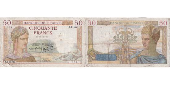 | | France, 50 Francs, Cérès, 1940, J.11958, VF(30-35), Fayette:18.37, KM:85b | | | Signature P. Rousseau and R. Favre-Gilly. 4.11.1937-18.4.1940., Ceres and Park of Versailes at left, reclining figure at right. Signature title: LE CAISSIER GÉNÉRAL., Mercury at right with caduceus. | | FEATURES |