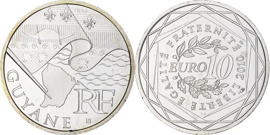| | France, 10 Euro, Guyane, 2010, Paris, , Silver, KM:1654 | | | Value at center, wreath horizontal | | FEATURES |