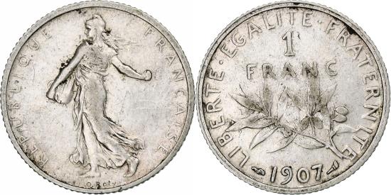 | | France, Franc, Semeuse, 1907, Paris, Silver, , Gadoury:467, KM:844.1 | | | Semeuse, Figure sowing seed, Leafy branch divides date and denomination, Without mint mark. | | FEATURES |