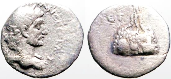 Hadrian AR14 hemidrachm. Cappadocia, Caesarea. Mt. Argaeus Obv: Laureate bust of Hadrian right, drapery on left shoulder. AUYTO KAIC TPAI AΔPIANOC CЄBACT. Rev: Naked male deity (Helios?) standing facing, head left, atop Mount Argaeus holding globe and scepter; ЄT - Δ RPC III 3071. 1.80g. 120-121AD. |