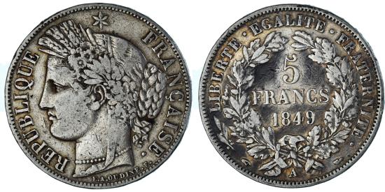 | | Coin, France, Cérès, 5 Francs, 1849, Paris, , Silver, KM:761.1 | | | Cérès, Liberty head with grain wreath left, Denomination within wreath, Hand and Dog | | FEATURES |