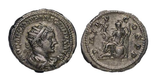 AD 218-222. AR Antoninianus (23mm, 61.15 grams). Rome mint. Struck AD 219. Radiate and draped bust right / Roma seated left, holding Victory and scepter; shield to right in front of throne. RIC IV 12; Thirion 15; RSC 138.