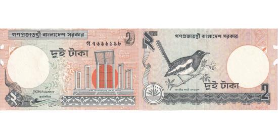 | | Bangladesh, 2 Taka, KM:6Ca, VF(30-35) | | | Solid security thread. 4 signature varieties., Shahid Minar, Martyr's Monument at right., Dhyal or Magpie-robin at left., Gray-green on orange and green underprint. | | FEATURES |